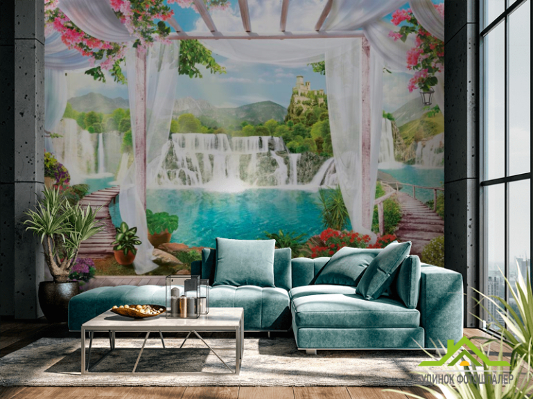 Фотообои Водопад, замок, цветы Фотообои Водопад, замок, цветы