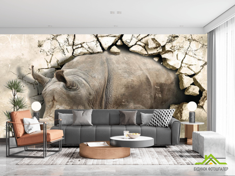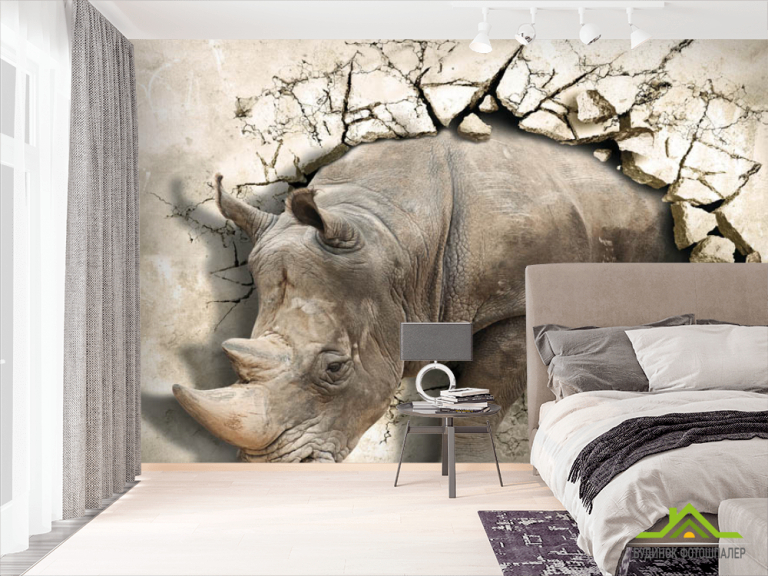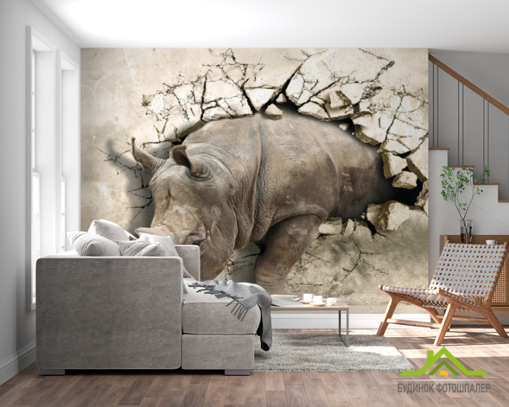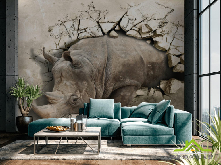 Фотообои носорог выходит со стены Фотообои носорог выходит со стены