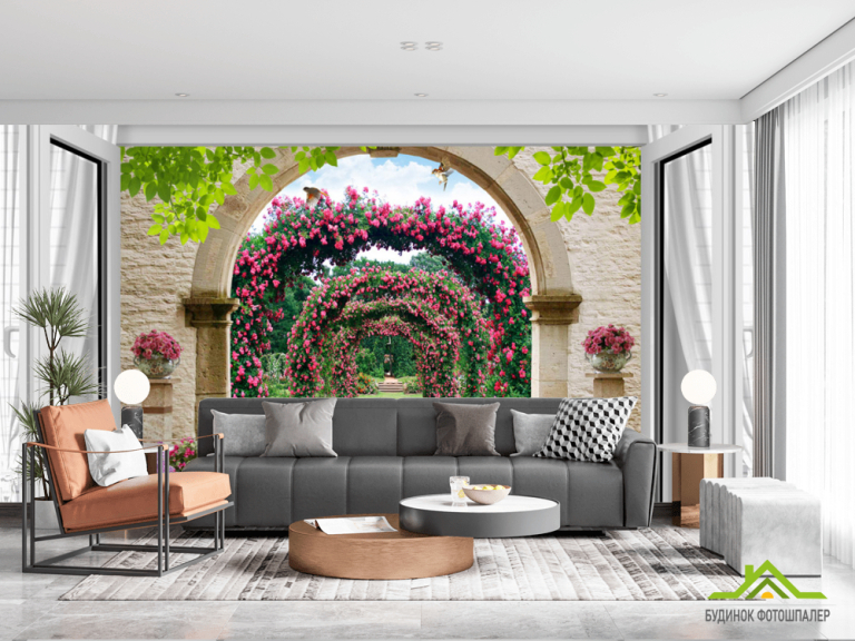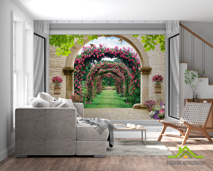 Фотообои Вид из окна на сад с розами
