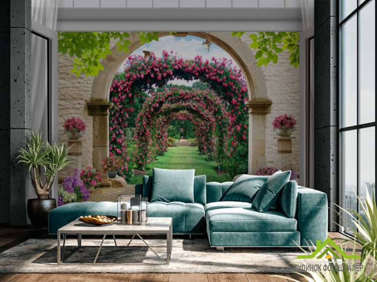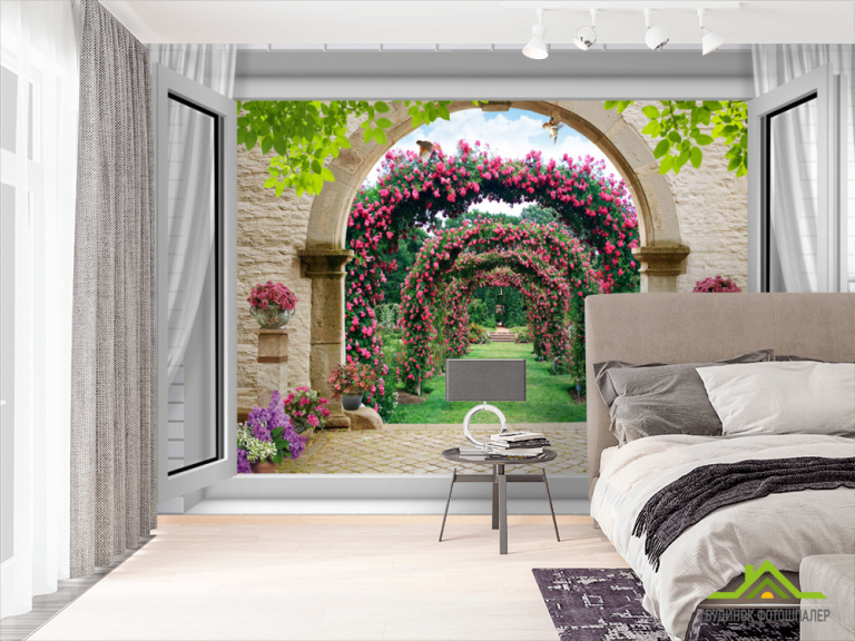 Фотообои  Вид из окна на сад с розами Фотообои  Вид из окна на сад с розами