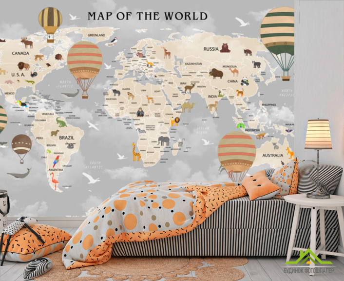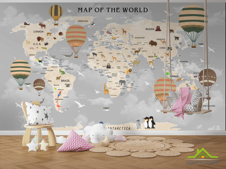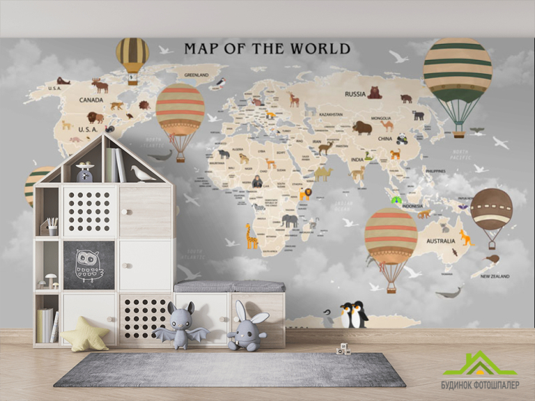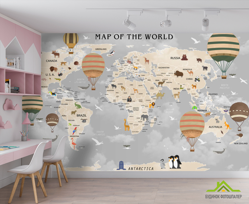 Фотообои Серая карта на английском с воздушными шарами Фотообои Серая карта на английском с воздушными шарами