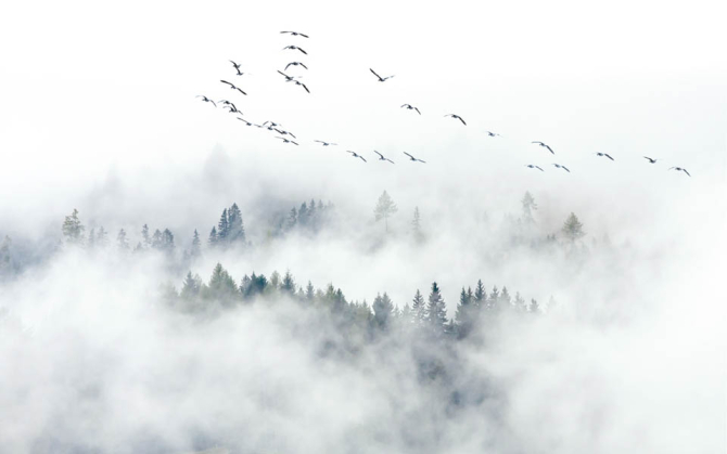 Фотообои Птицы над туманным лесом