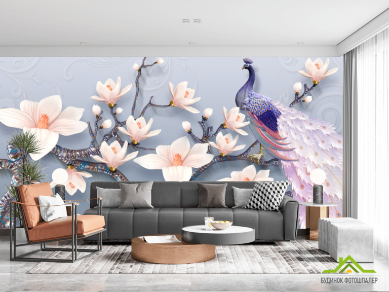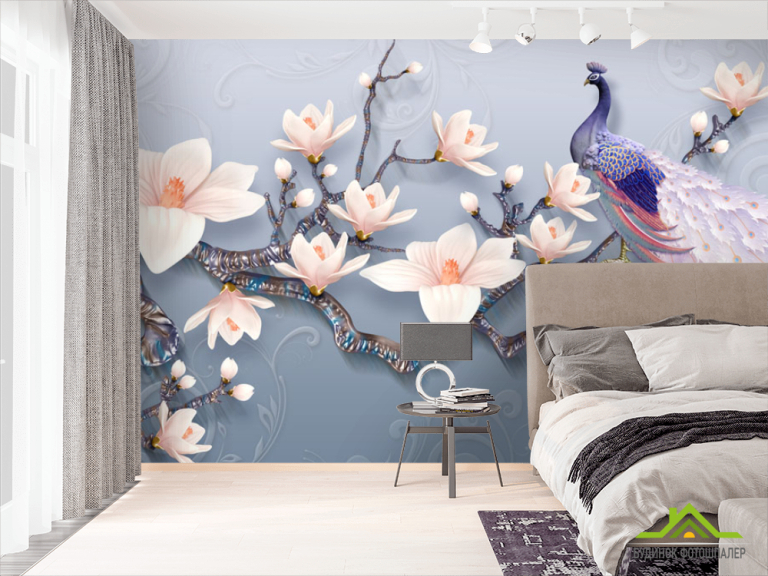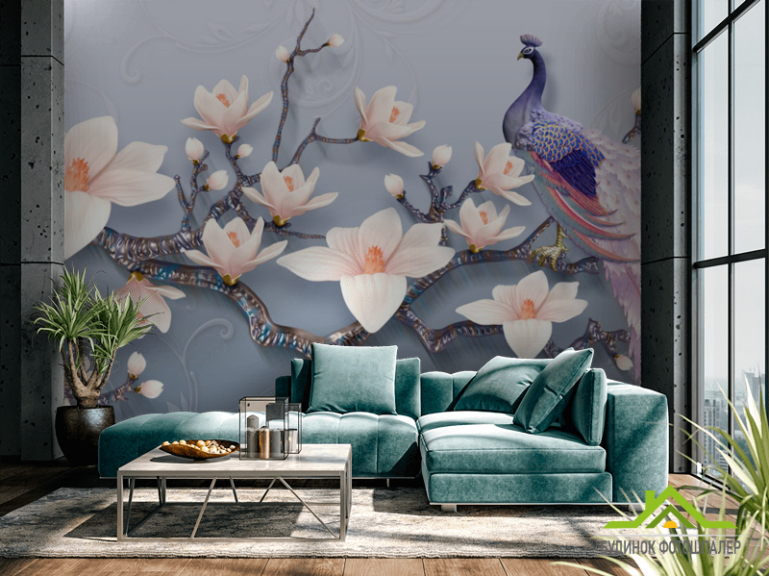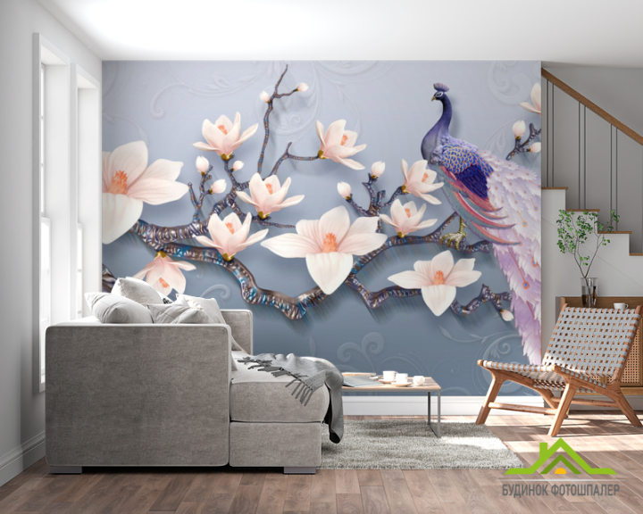 Фотообои Цветы магнолии и павлин Фотообои Цветы магнолии и павлин