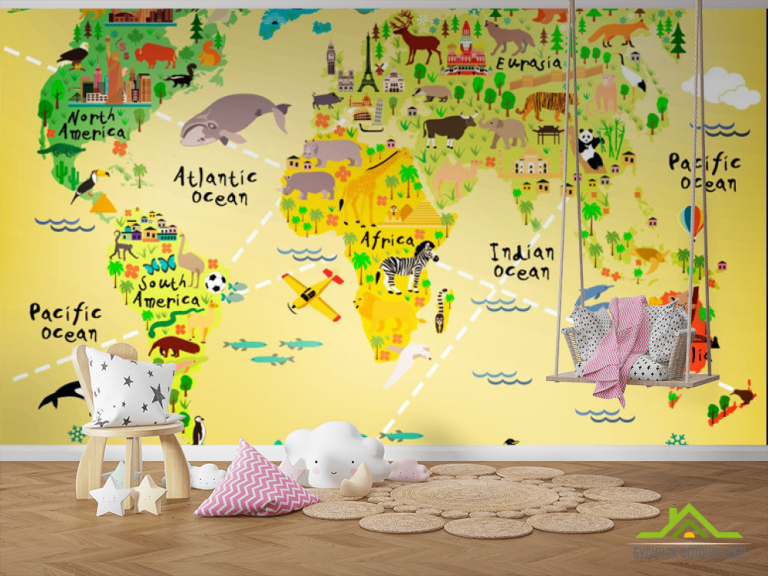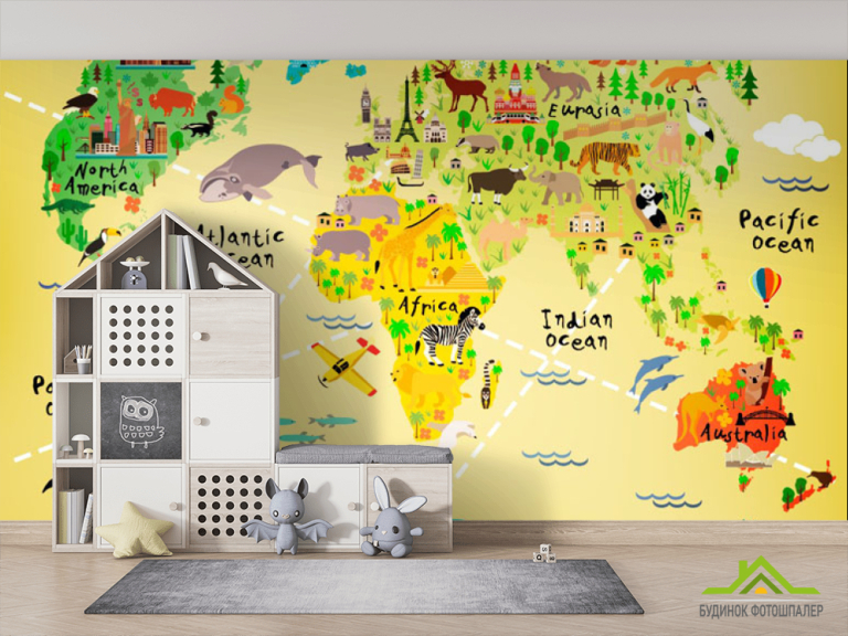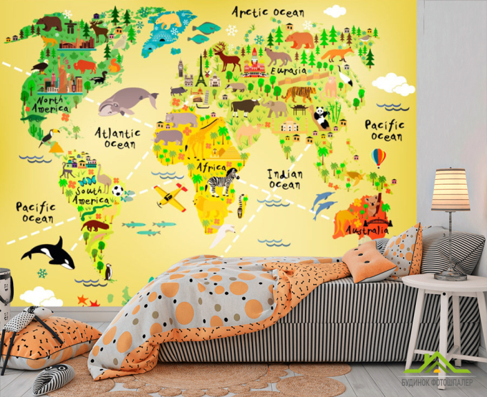 Фотообои Желтая детская карта с животными Фотообои Желтая детская карта с животными