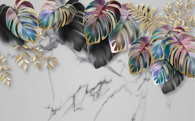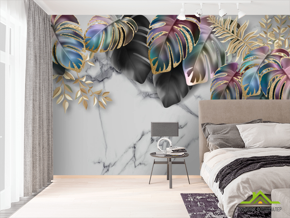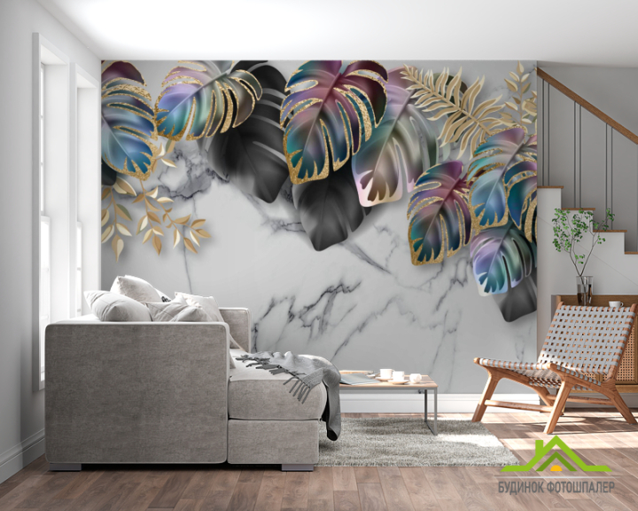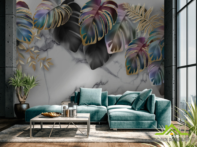 Фотообои Тропические листья на мраморе Фотообои Тропические листья на мраморе