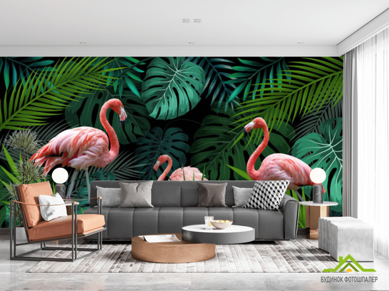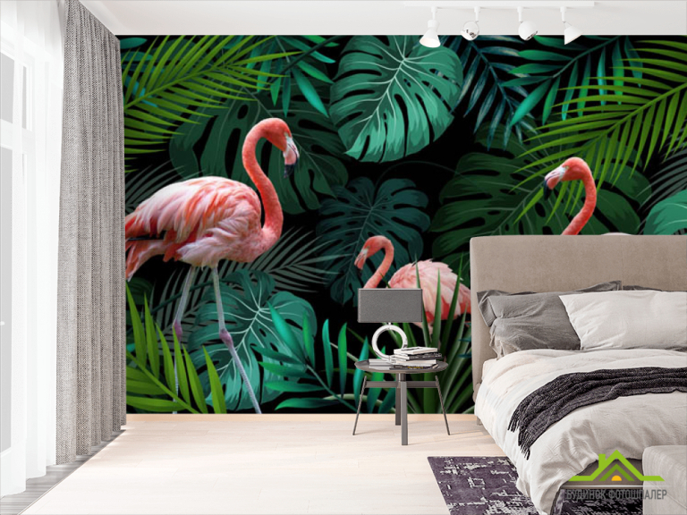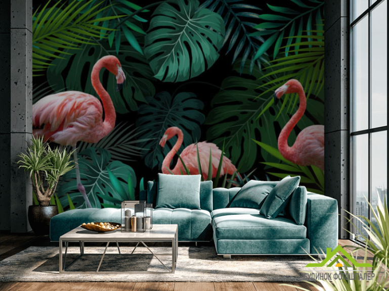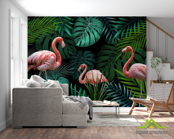 Фотообои фламинго на тропических листьях Фотообои фламинго на тропических листьях