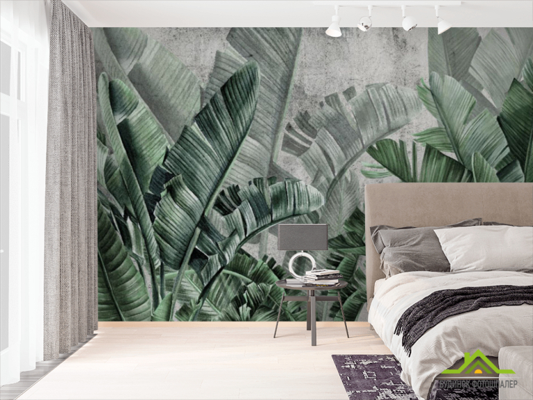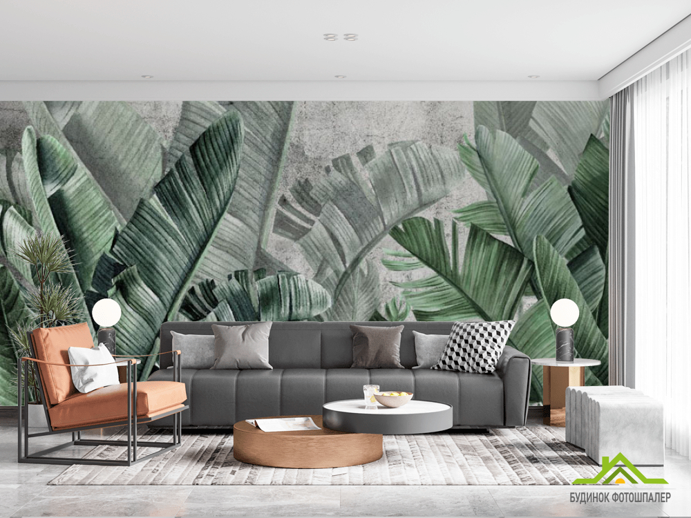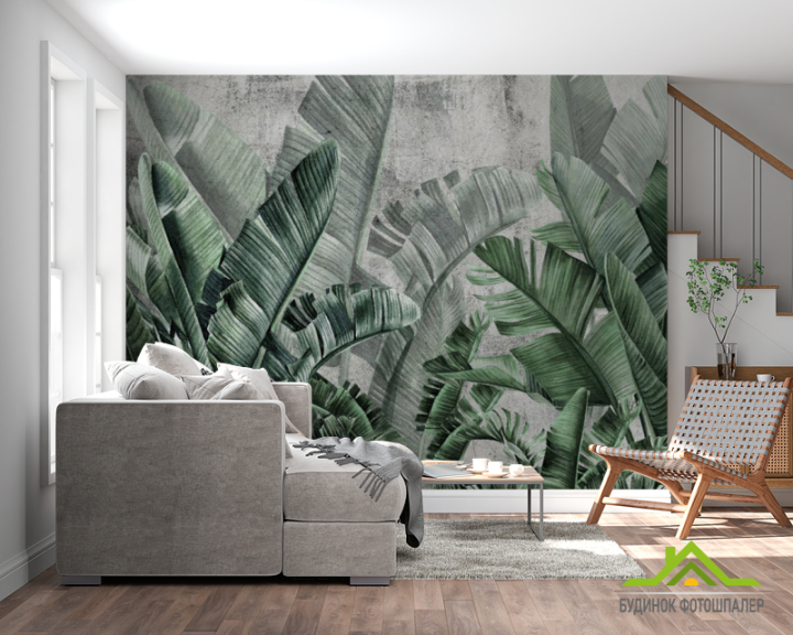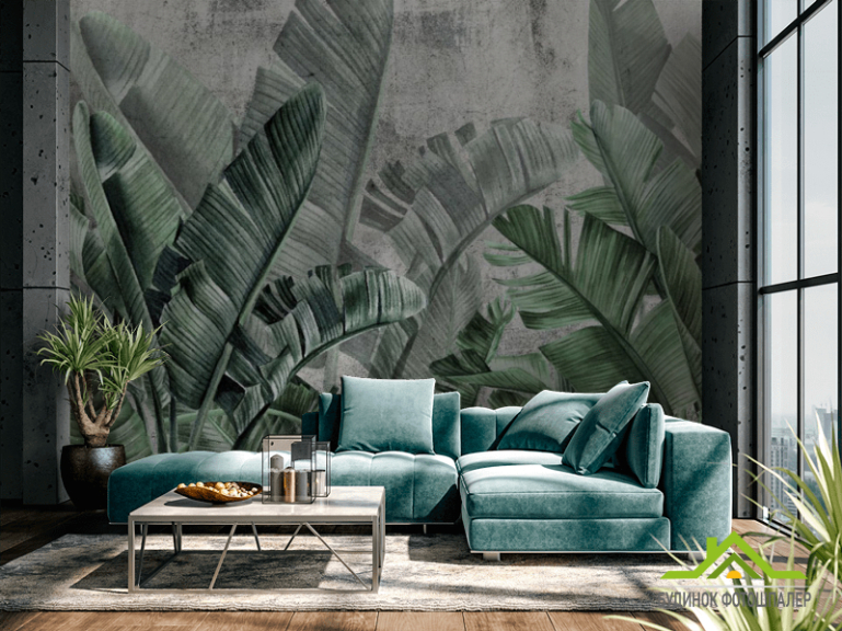 Фотообои Зеленые тропические листья на фоне бетона. Фотообои Зеленые тропические листья на фоне бетона.