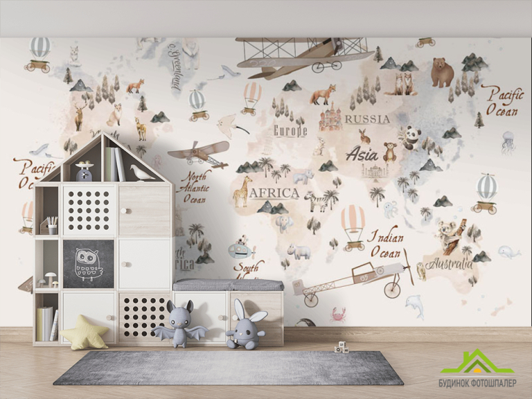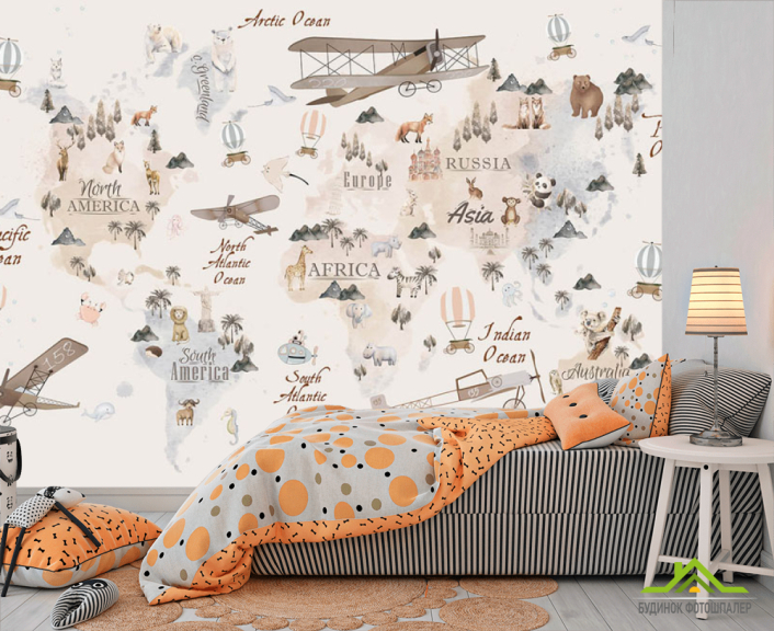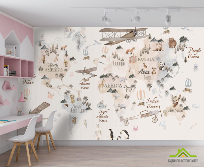 Фотообои Бежевая карта с воздушными шарами и самолетами на английском