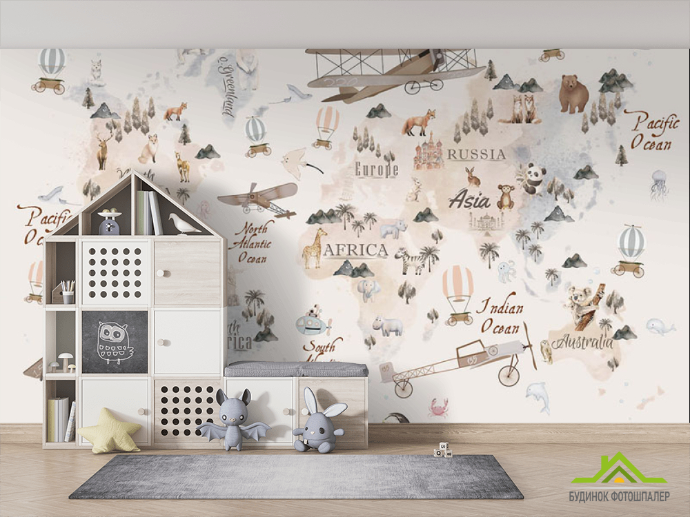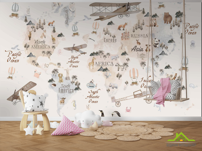 Фотообои Бежевая карта с воздушными шарами и самолетами на английском Фотообои Бежевая карта с воздушными шарами и самолетами на английском
