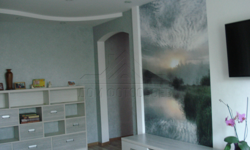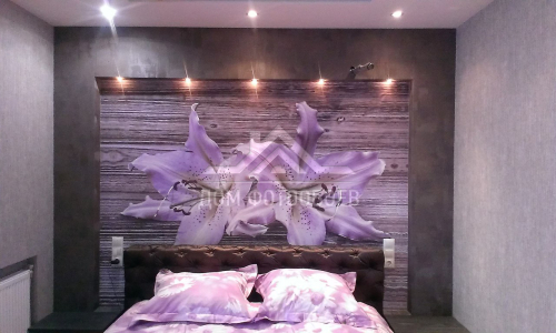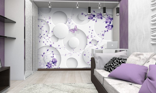 3D обои с изображением объемных кругов и выпуклых шаров, дополненные нежными сиреневыми цветами — прекрасное решение для гостиной комнаты. Нежная сиреневая ветвь с цветами сделает акцент на нежности, умиротворенности. Обои прекрасно подходят гостиной комнаты, оформленной в ультрасовременный дизайн.