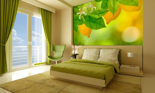 Фотообои с изображением лимонного дерева, плодоносящего желтыми сочными плодами и с ещё цветущими завязями — это бодрое свежее утро каждый день. Коллаж идеально подойдет для интерьера спальни, оформленной в нежно-зеленых оттенках.