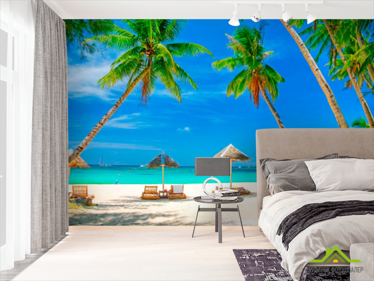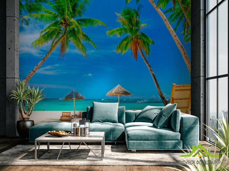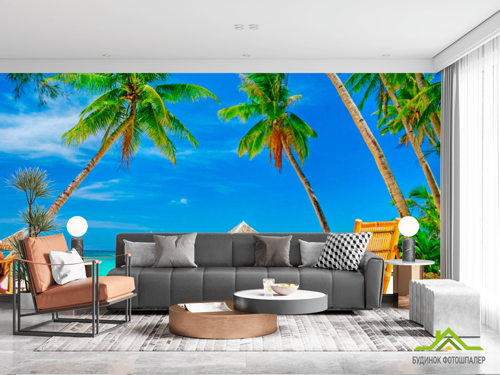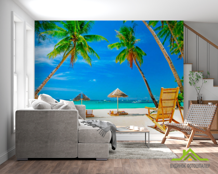 Фотошпалери Шезлонг, пальми, пляж Фотошпалери Шезлонг, пальми, пляж