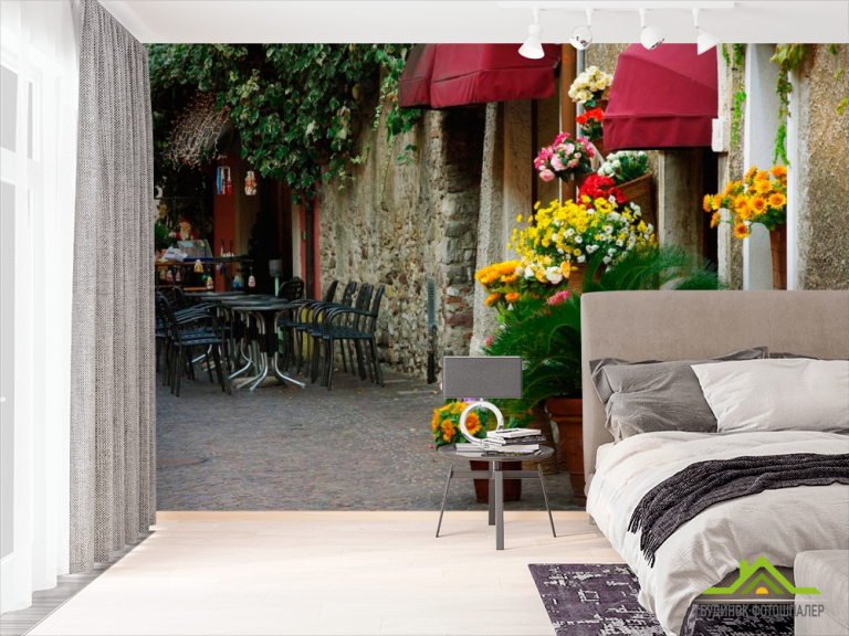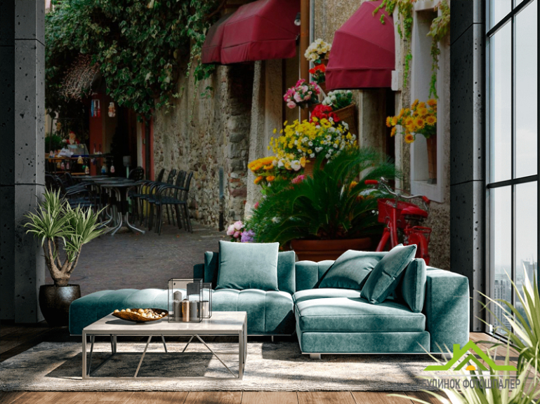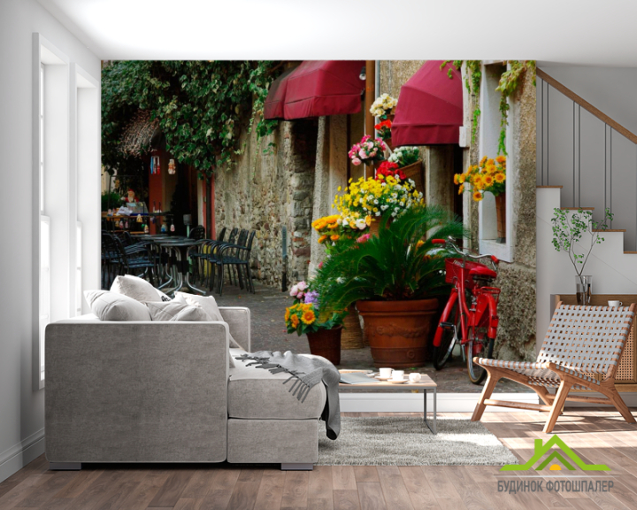 Фотошпалери Кафе на вулиці з квітами Фотошпалери Кафе на вулиці з квітами