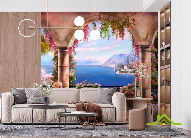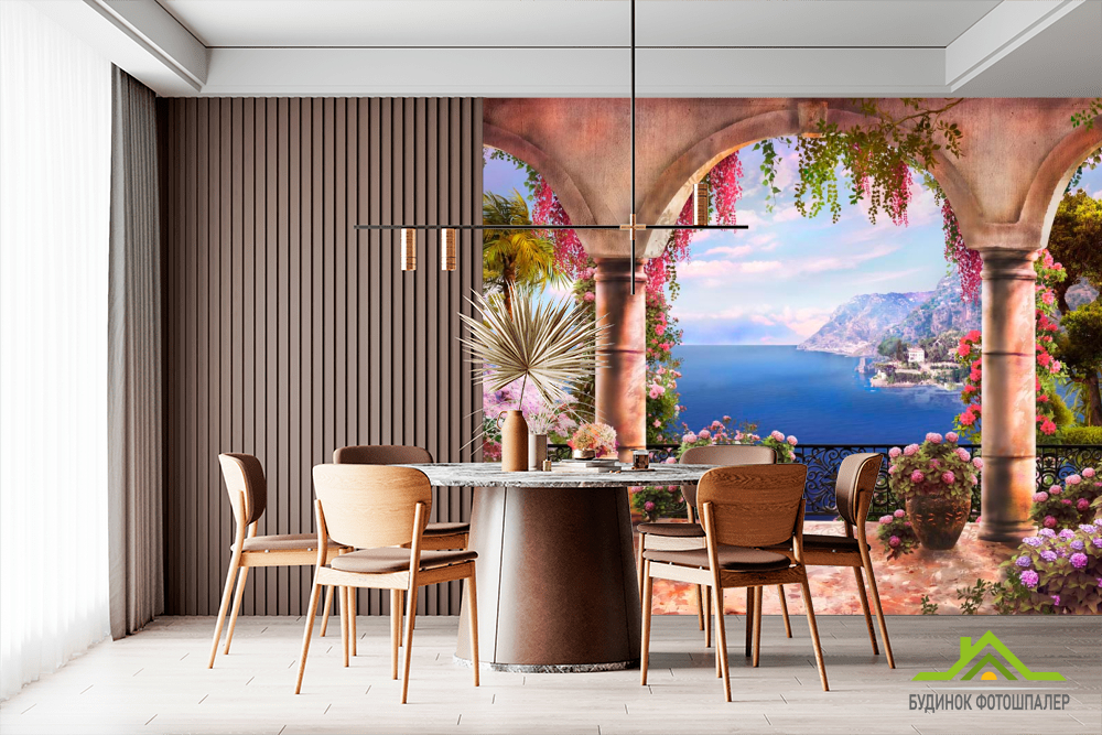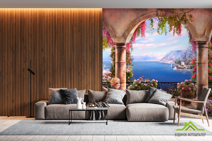 Фотошпалери Море, гори, балкон, квіти Фотошпалери Море, гори, балкон, квіти