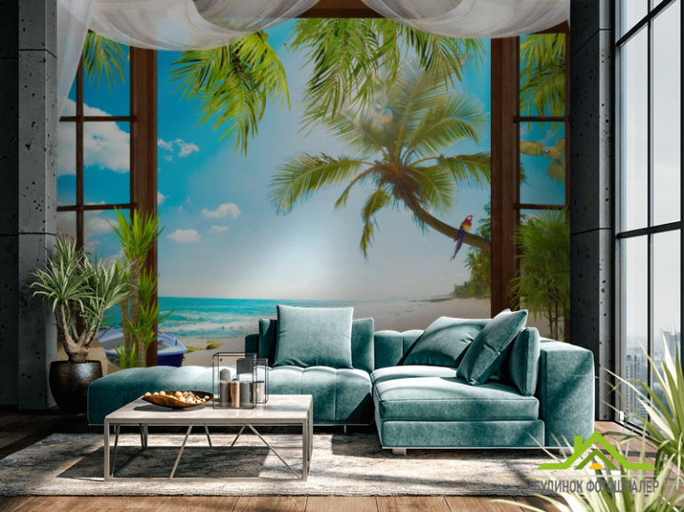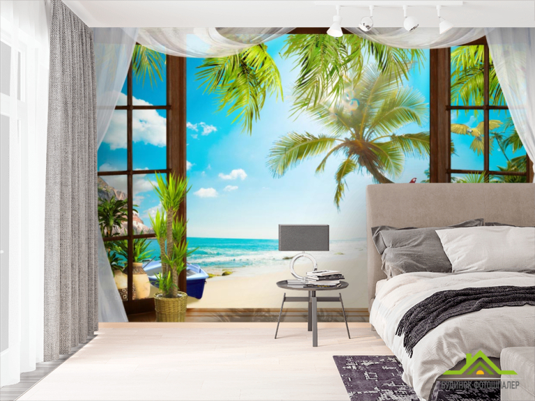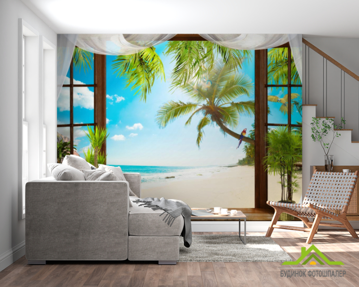 Фотошпалери Вид з вікна на пальми і море Фотошпалери Вид з вікна на пальми і море