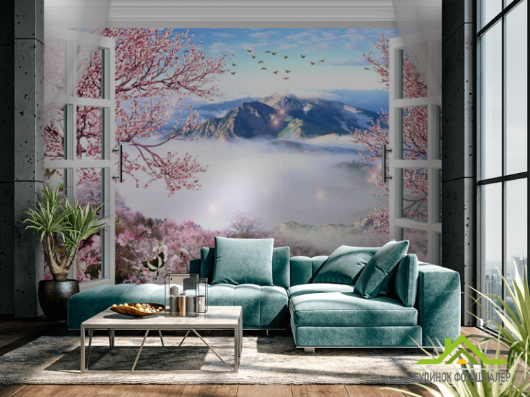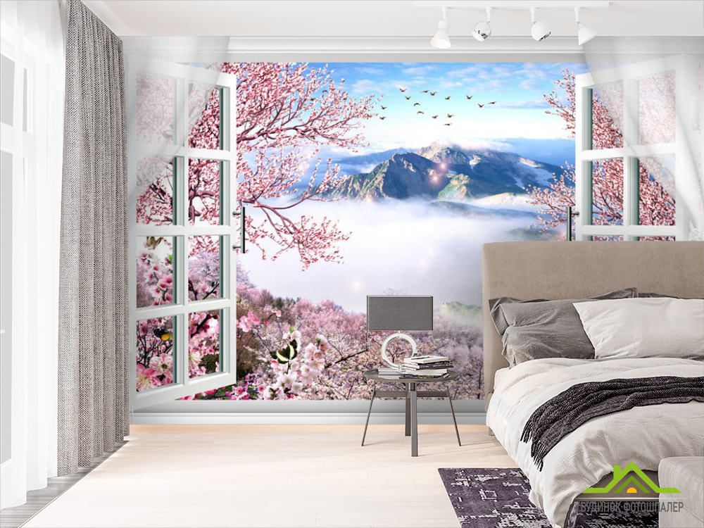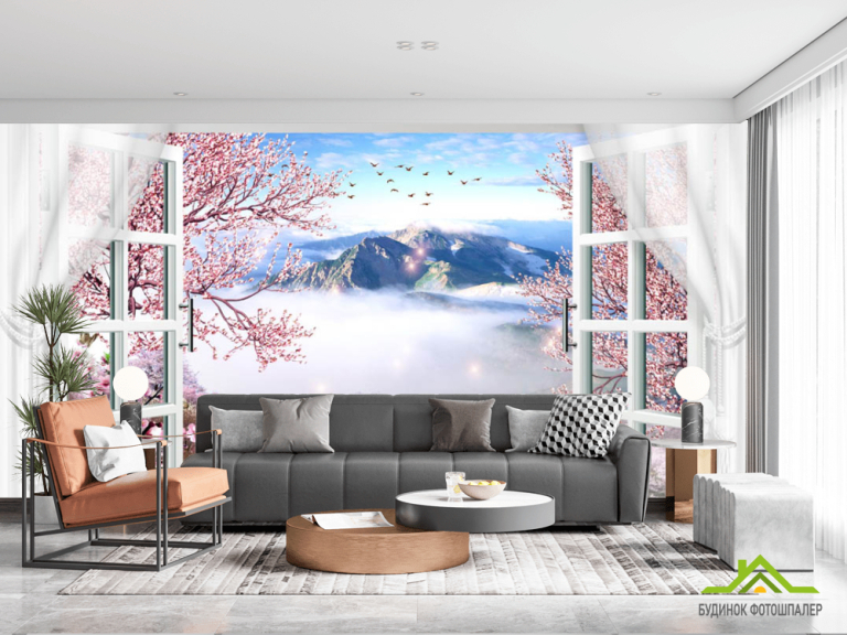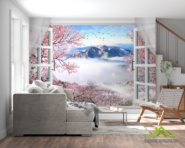 Фотошпалери вікно з видом на сакуру і гори Фотошпалери вікно з видом на сакуру і гори