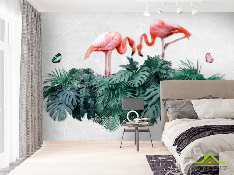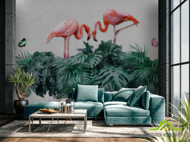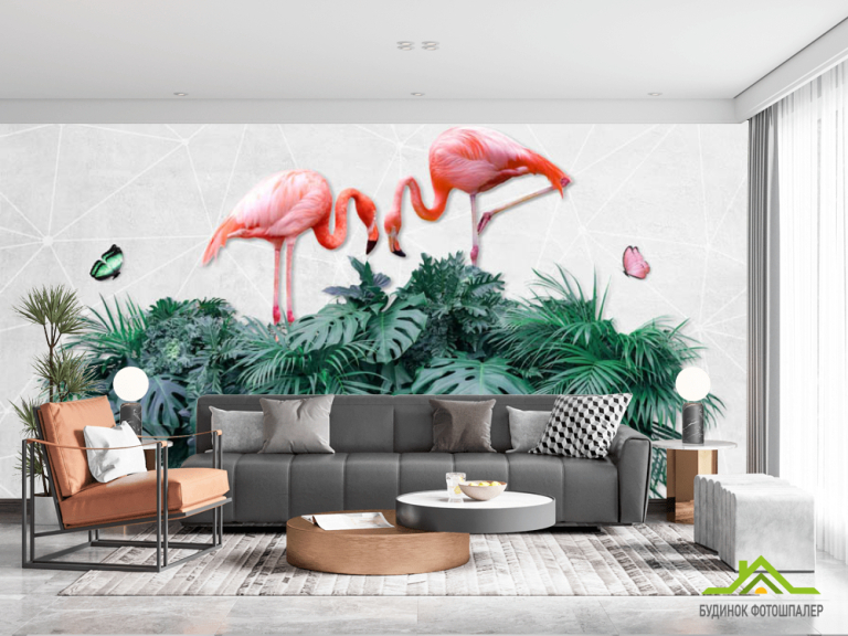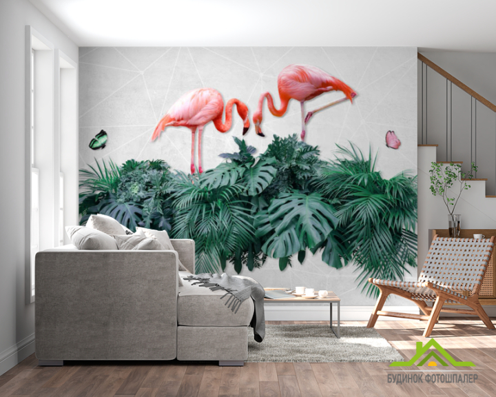 Фотошпалери фламінго на тропічних листках