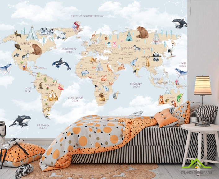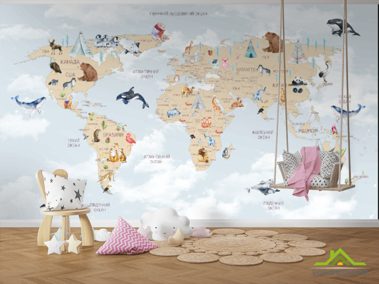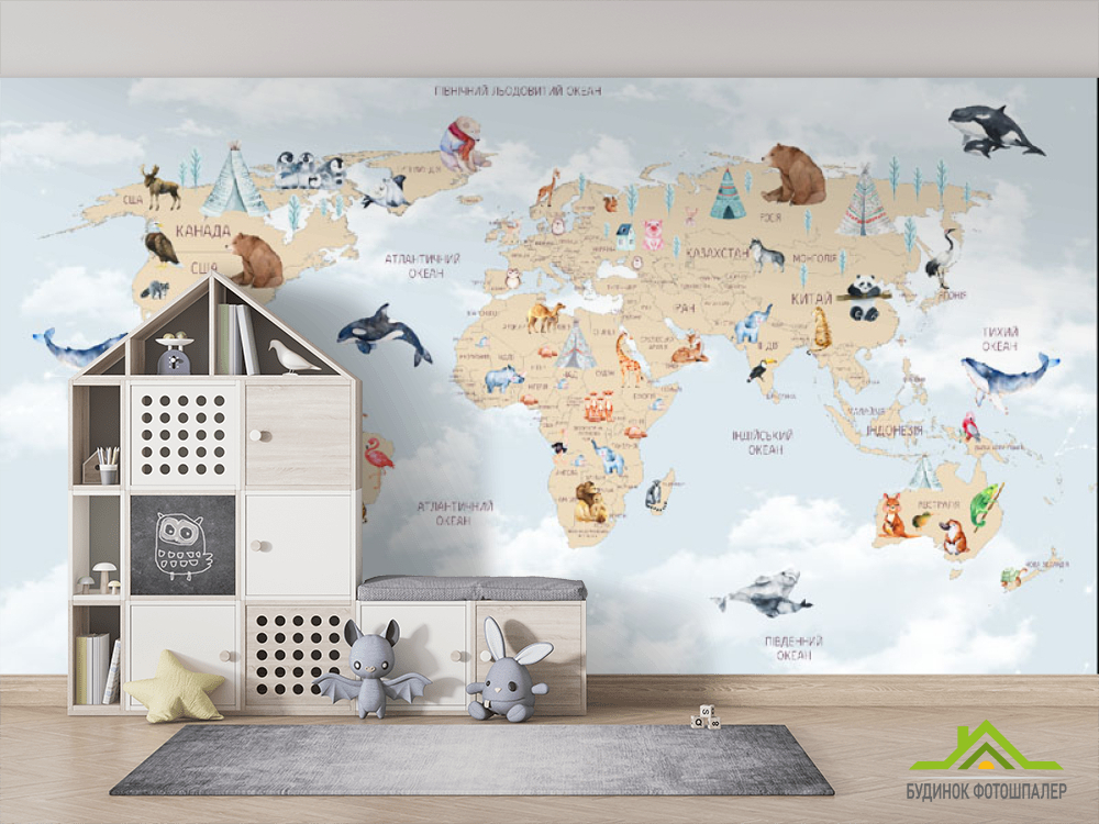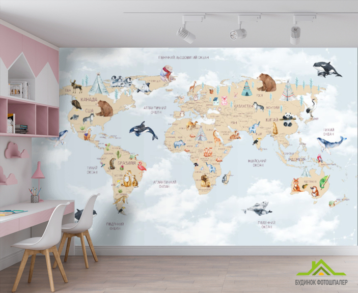 Фотошпалери карта дитяча з хмарками українською мовою в синьому кольорі.
