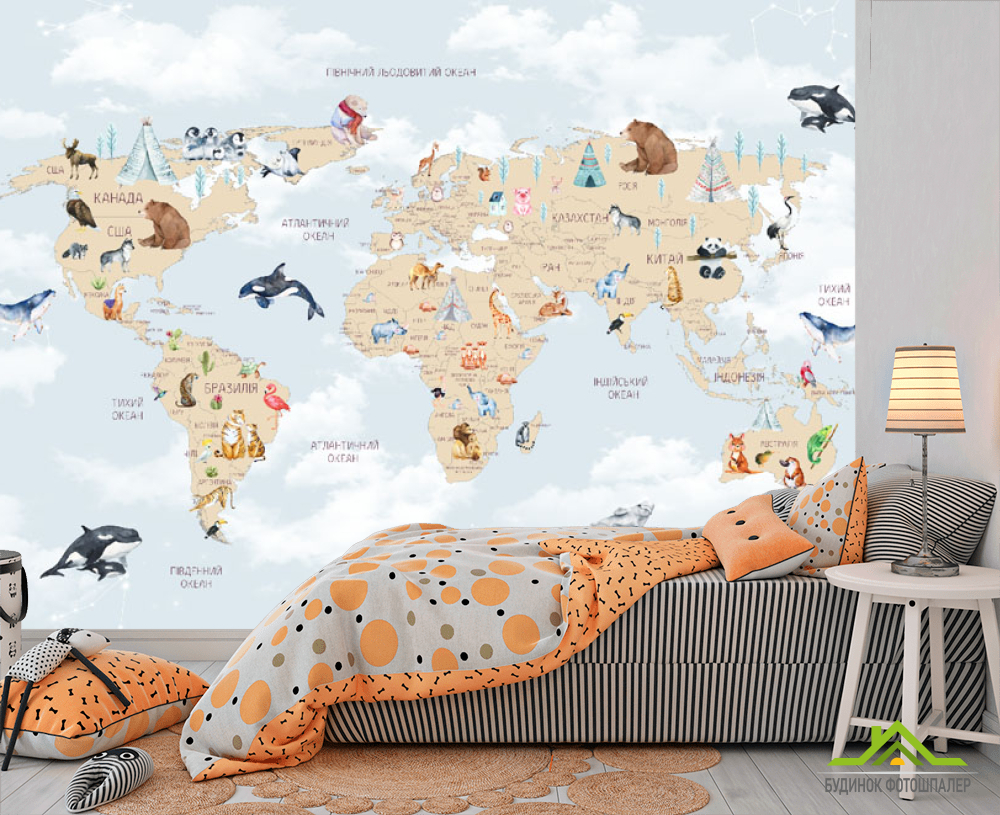 Фотошпалери карта дитяча з хмарками українською мовою в синьому кольорі. Фотошпалери карта дитяча з хмарками українською мовою в синьому кольорі.