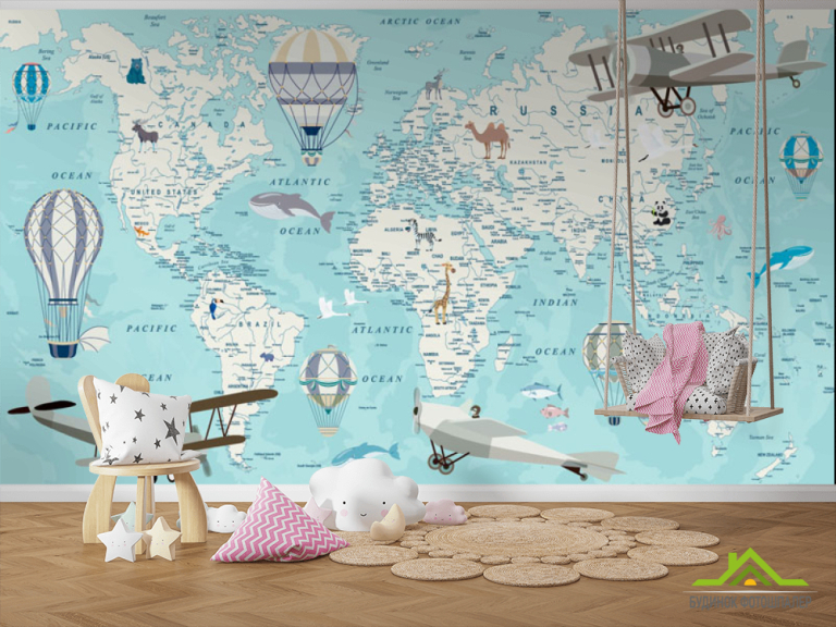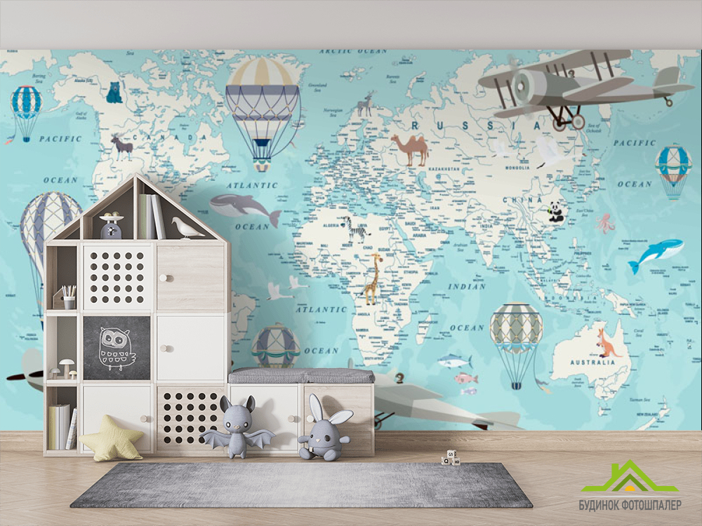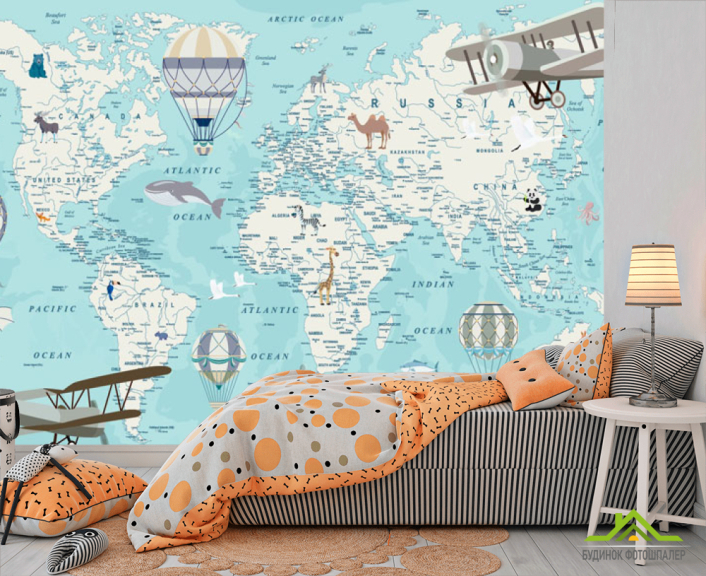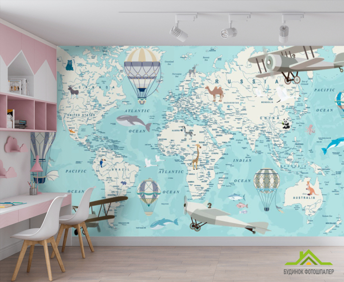 Фотошпалери Бірюзова карта дитячий Англійська з літаками