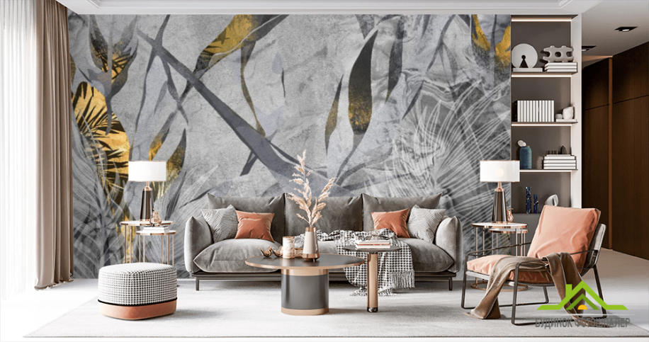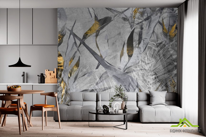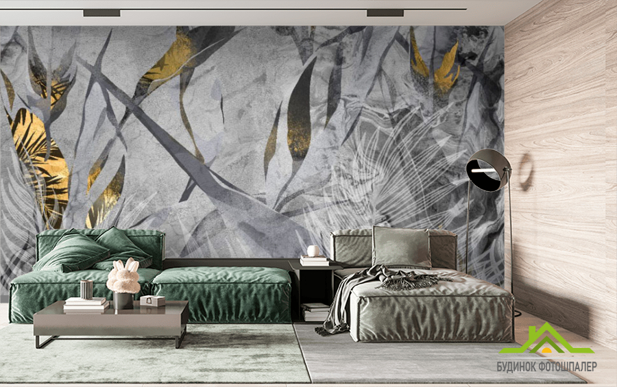 Фотошпалери сірі тропічні листя з золотом. Фотошпалери сірі тропічні листя з золотом.